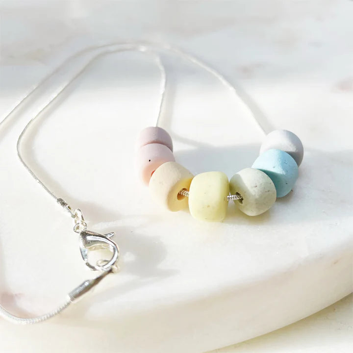 Seven handmade rainbow beads made from polymer clay in pastel shades, hang from a silver plated 18” chain with a lobster clasp.